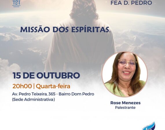 A palestra pública presencial ocorre na sede administrativa nas quartas-feiras. Nesta quarta teremos o tema “Missão dos Espíritas”, com Rose Menezes. Horário de funcionamento:FEA Dom Pedro: Quarta-feira 15/10/25 às 20h