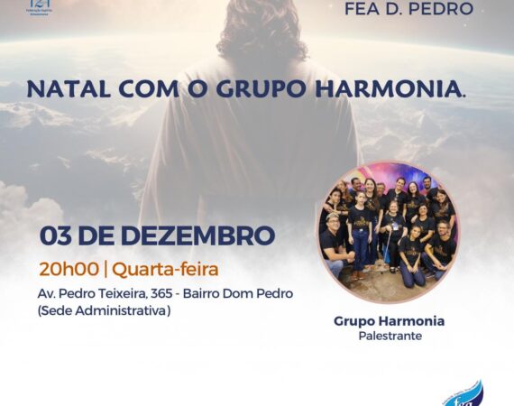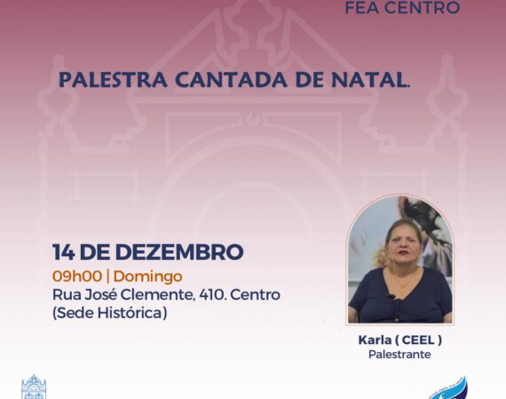 A palestra pública presencial ocorre na sede administrativa nas quartas-feiras. Nesta quarta teremos a palestra cantada de Natal, com o grupo Harmonia. Horário de funcionamento:FEA Dom Pedro: Quarta-feira 03/12/25 às 20h