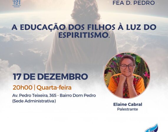 A palestra pública presencial ocorre na sede administrativa nas quartas-feiras. Nesta quarta teremos o tema “A educação dos filhos á luz do Espiritismo”, com Elaine Cabral. Horário de funcionamento:FEA Dom Pedro: Quarta-feira 17/12/25 às 20h