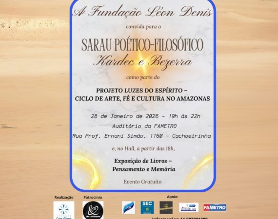📍 Local: Universidade FAMETRO📅 Data: 28 de janeiro de 2026⏰ Horário: 19h às 22h O Sarau marca a abertura pública do projeto, reunindo música, poesia, cenas teatrais e reflexão filosófica em ambiente universitário.O evento conta ainda com Exposição de Livros no hall da instituição, integrando obras espíritas e educacionais relacionadas...